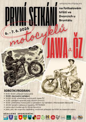 Nenechte si ujít jedinečnou příležitost zúčastnit se ve dnech 6.-7.6.2026 Prvního setkání motocyklů JAWA a ČZ. Akce se koná na fotbalovém hřišti ve Dvorcích.