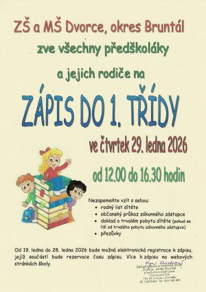 ZŠ a MŠ Dvorce zve děti a jejich rodiče, na zápis do 1. třídy